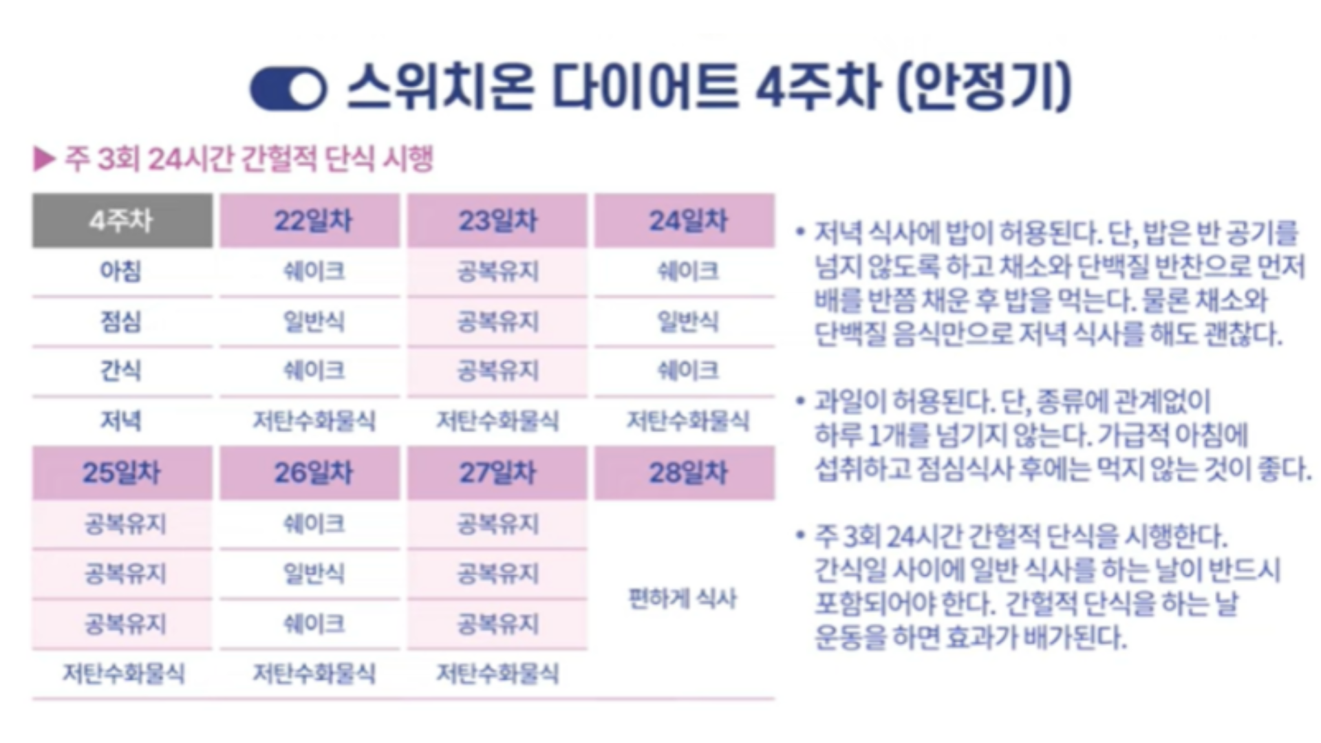 대사 상태를 안정적으로 유지하고, 체중 감량 효과를 장기적으로 지속시키는 단계입니다. 4주차에는 일반식을 먹을수 있지만 3번의 간헐적 단식을 해야합니다. 저녁에 탄수화물을 섭취해도 되지만 적정량을 넘지 않도록 주의합니다.