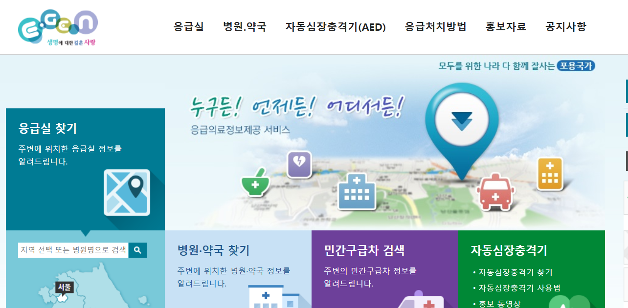 응급상황 시 129 응급의료포털 또는 위의 앱을 통해 가까운 응급실을 확인하세요.
