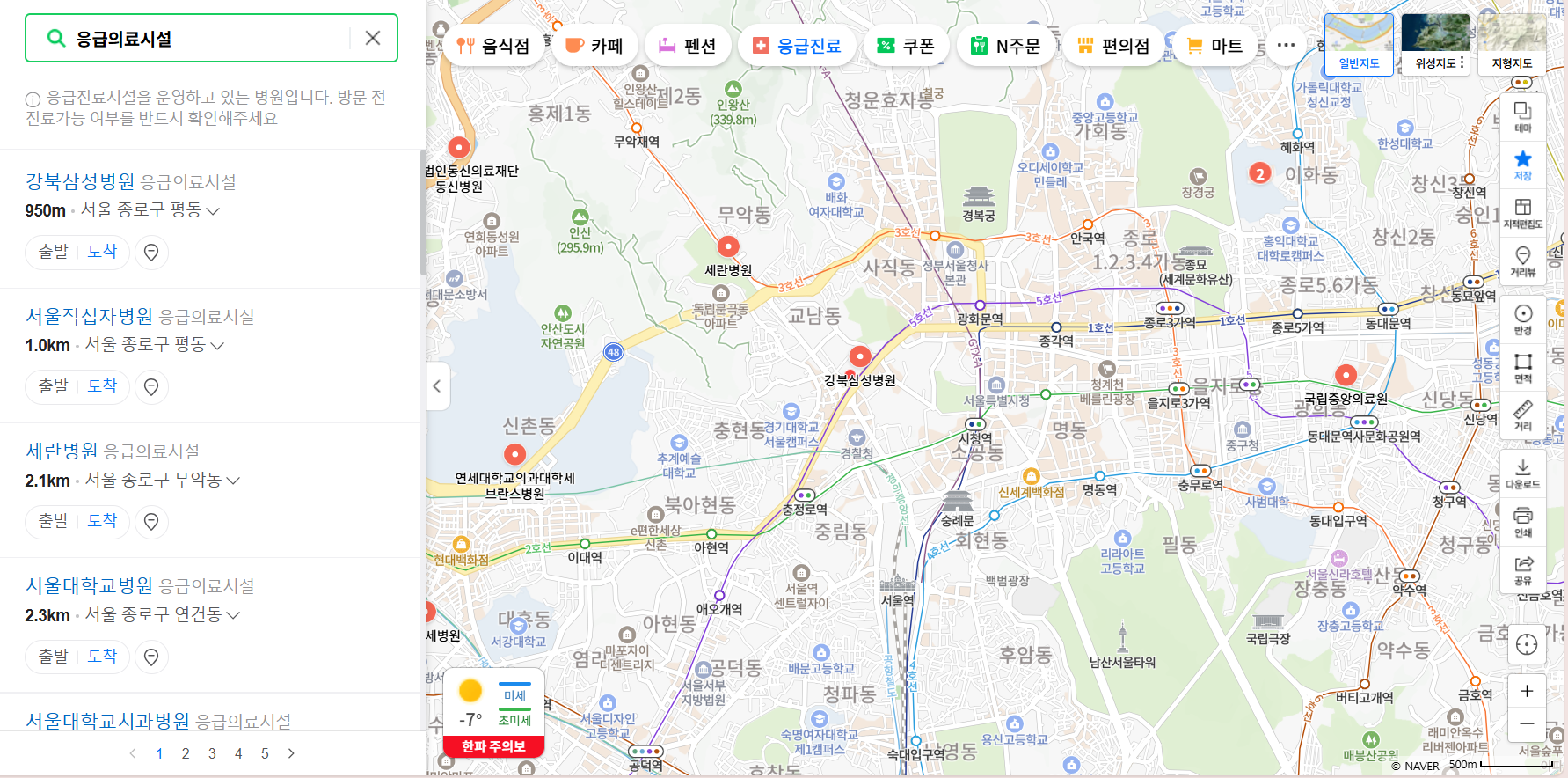 - ‘주말 병원’, ‘휴일 약국’, ‘응급실’ 등의 키워드 입력, 혹은 지도 상단의 응급진료를 클릭하면 주변 병원 확인 가