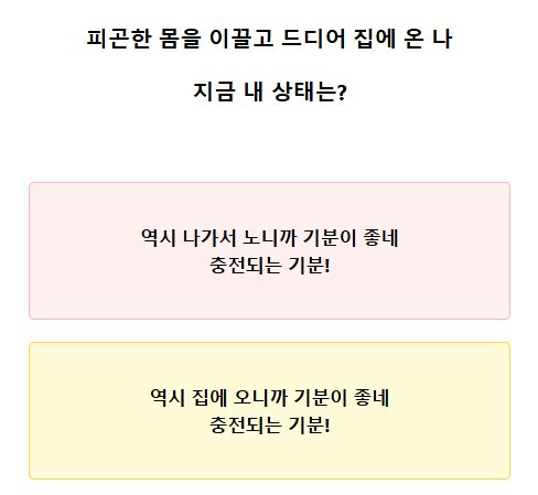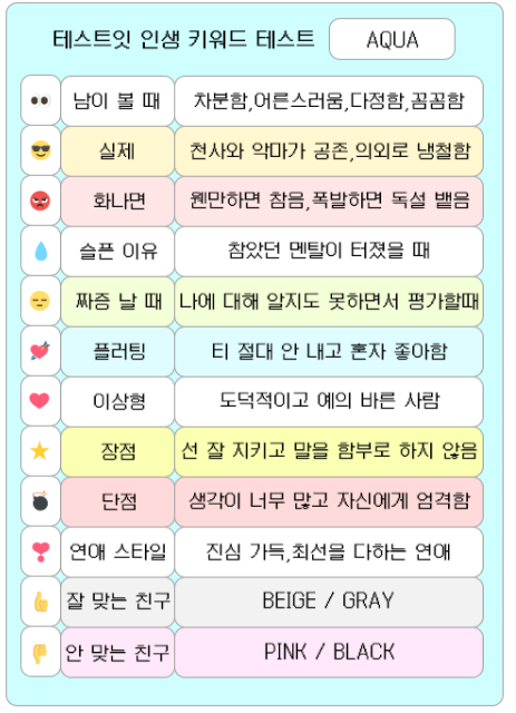 테스트에서는 기쁠때나 화날 때 등 감정에 대한 반응이나 연애 스타일 같은 심리적인 요소를 가지고 테스트를 합니다. 질문들에 답을 하고 나면 각 상황에 맞는 내 성격의 특징과 맞는 MBTI 유형과 색상을 함께 볼 수 있습니다.