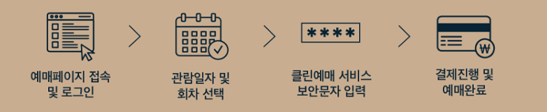 - 예매페이지 접속 및 로그인 → 관람일자 및 회차 선택 → 클린예매 서비스 보안문자 입력 → 결제진행 및 예매완료