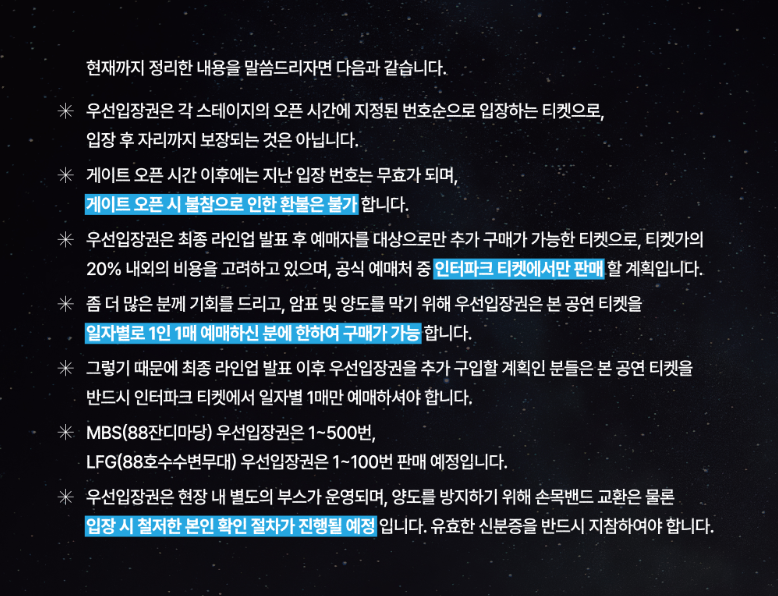- 밤샘 대기 방지를 위해 최종 라인업 공개 후 우선입장권이 별도로 판매될 예정입니다.