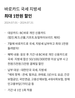 BC카드 앱 페이북에서 '마이태그' 혜택중에 있는 '바로카드 국세, 지방세 최대 1만원 할인' 을 태그 하고 BC 카드로 결제하면 최대 1만원이 할인됩니다.