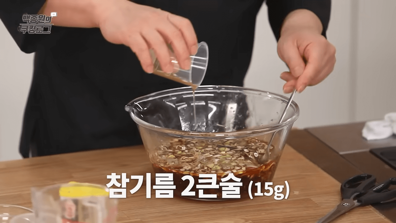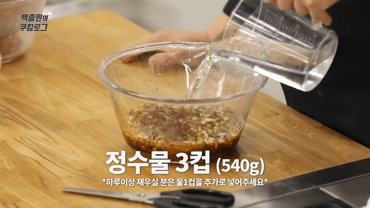 - 생강과 참기름: 다진 생강 1/2숟갈과 참기름 2숟갈을 넣고 잘 섞어줍니다. 마지막으로 물 3컵을 넣어 양념을 완성합니다.