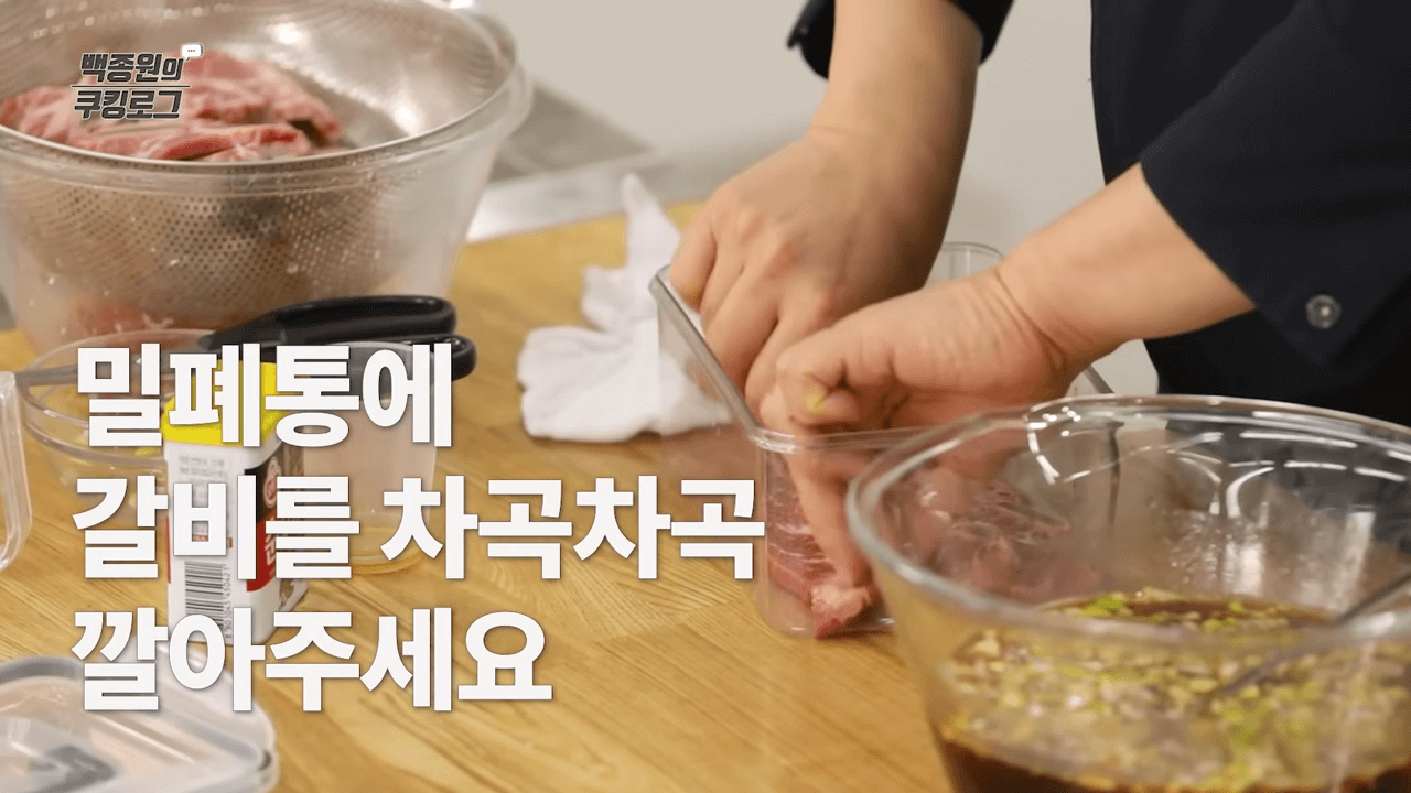 - 1단계: 김치통이나 큰 보관용 용기에 물기를 뺀 LA갈비를 넣어줍니다.