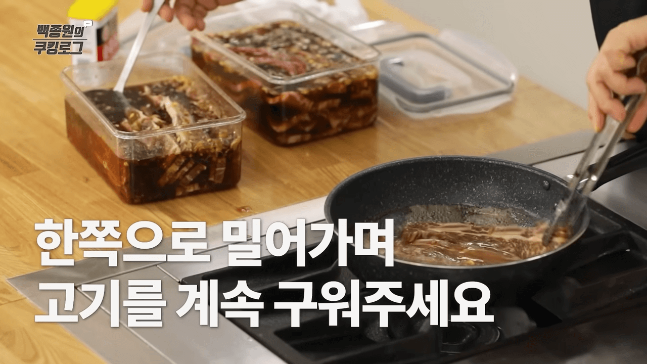 이제 재워둔 갈비를 맛있게 구워볼 차례입니다. 여기서 백종원 레시피만의 특별한 비법이 등장합니다.